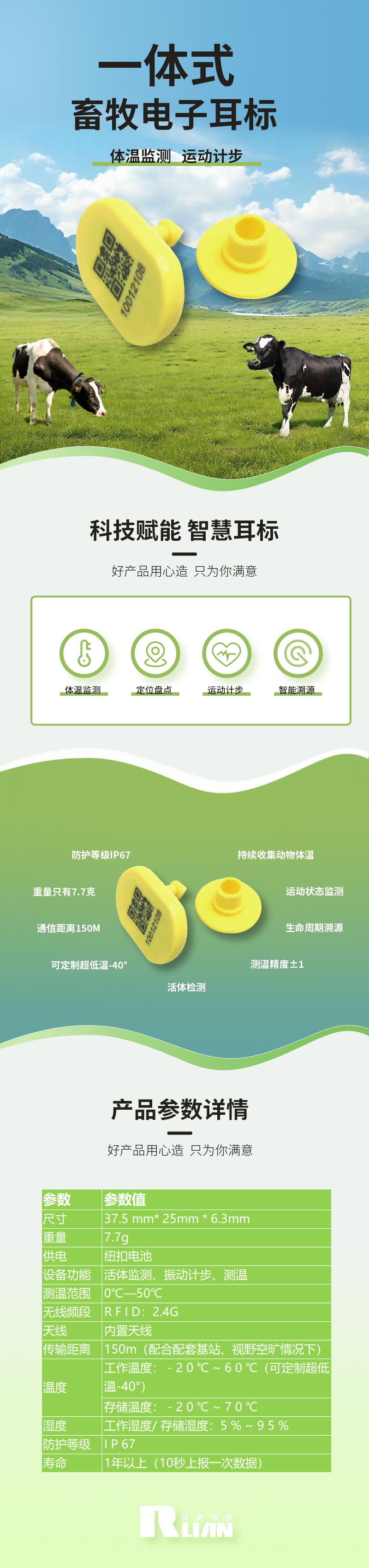 RFID測溫定位耳標是我司自主研發(fā)的2.4G RFID無線測溫終端,該產(chǎn)品佩戴于動物耳朵上,可對動物的溫度、運動狀態(tài)、動物生命周期的溯源等數(shù)據(jù)進行收集,數(shù)據(jù)傳輸給RFID接收器后,上傳到大數(shù)據(jù)平臺,對動物的體溫異常、發(fā)病等可進行有效監(jiān)管、動物生命周期數(shù)據(jù)進行可靠溯源,被廣泛應用在智慧畜牧解決方案中。