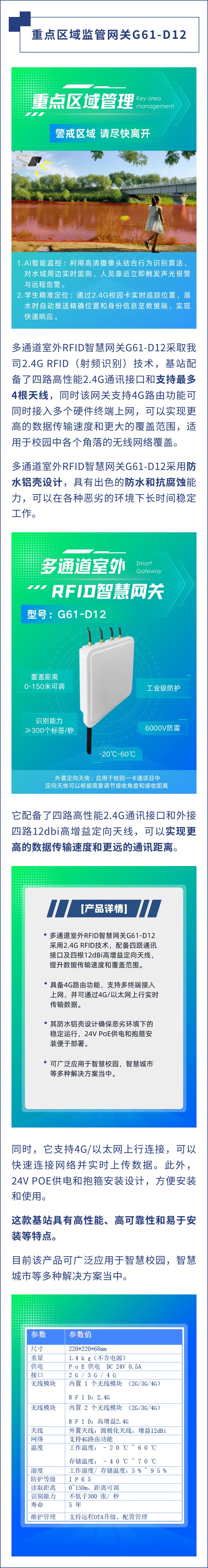 多通道室外RFID智慧網(wǎng)關(guān)G61-D12采取我司2.4G RFID(射頻識別)技術(shù),基站配備了四路高性能2.4G通訊接口和支持最多4根天線,同時該網(wǎng)關(guān)支持4G路由功能可同時接入多個硬件終端上網(wǎng)。可以實現(xiàn)更高的數(shù)據(jù)傳輸速度和更大的覆蓋范圍,適用于校園中各個角落的無線網(wǎng)絡(luò)覆蓋,多通道室外RFID智慧網(wǎng)關(guān)G61-D12采用防水鋁殼設(shè)計,具有出色的防水和抗腐蝕能力,可以在各種惡劣的環(huán)境下長時間穩(wěn)定工作。它配備了四路高性能2.4G通訊接口和外接四路12dbi高增益定向天線,可以實現(xiàn)更高的數(shù)據(jù)傳輸速度和更遠(yuǎn)的通訊距離。同時,它支持4G/以太網(wǎng)上行連接,可以快速連接網(wǎng)絡(luò)并實時上傳數(shù)據(jù)。此外,24V POE供電和抱箍安裝設(shè)計,方便安裝和使用。這款基站具有高性能、高可靠性和易于安裝等特點。