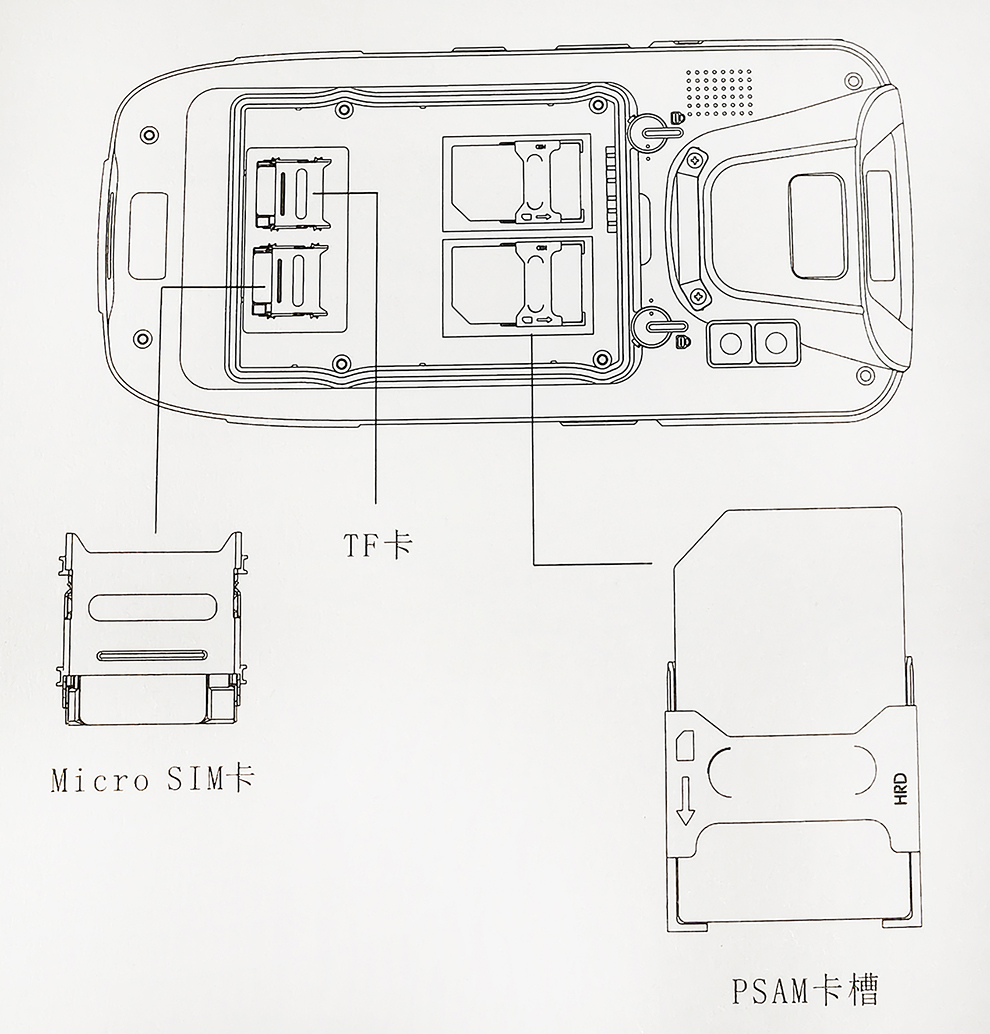 (注意:手持終端機(jī)只支持Micro SIM卡,標(biāo)準(zhǔn)SIM卡槽是用來安裝加密的PSAM卡)