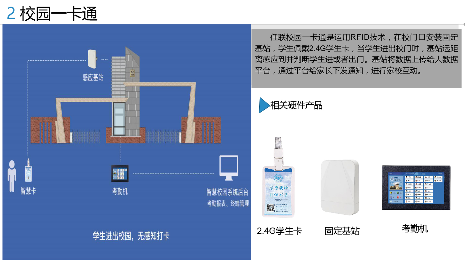 采用2.4GHz和13.56MHz高低雙頻混合技術(shù),2.4G高頻段用于進(jìn)出校門(mén)的遠(yuǎn)距離考勤刷卡,13.56M低頻段可用于宿舍門(mén)禁、飯?zhí)孟M(fèi)、打親情電話(huà)等近距離刷卡場(chǎng)合,一卡多用,方便攜帶。