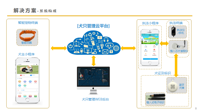 任聯(lián)犬只管理智能設(shè)備包含:植入式電子標(biāo)識(shí)、藍(lán)牙犬牌、智能項(xiàng)圈等。犬只管理系統(tǒng)主要有:公眾號(hào)與犬主小程序、公安執(zhí)法小程序、市政單位后臺(tái)等。