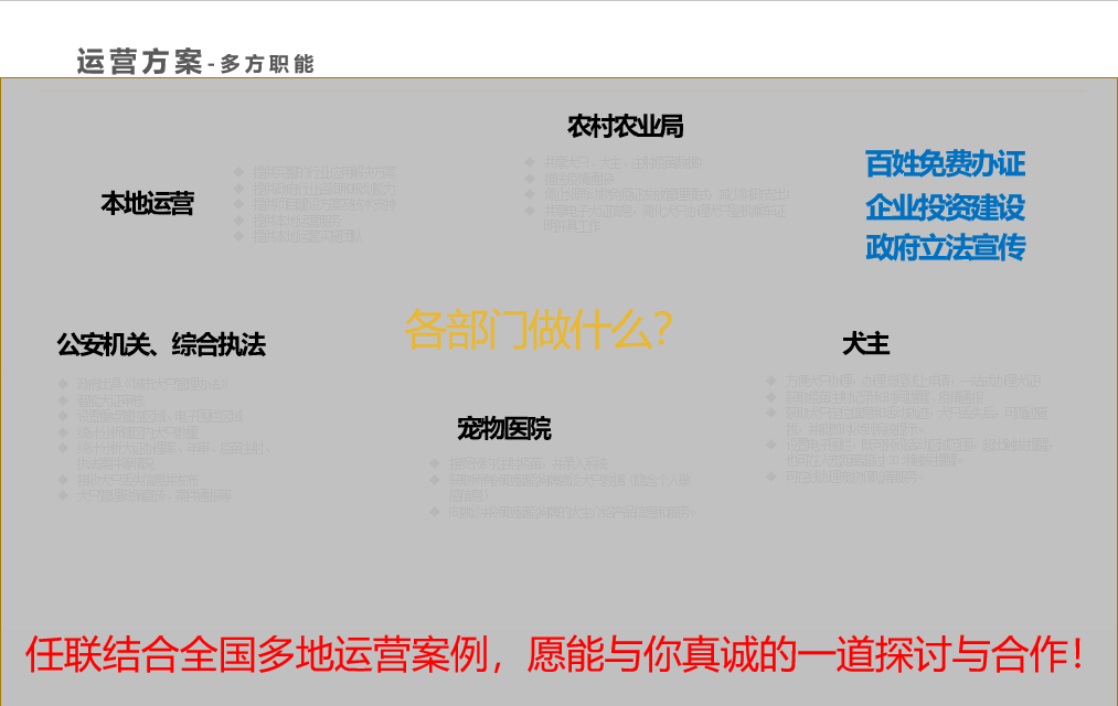 犬只管理落地執(zhí)行,各個(gè)城市相關(guān)法規(guī)和政策環(huán)境不一樣,運(yùn)營(yíng)方式也不一樣。任聯(lián)結(jié)合全國(guó)多地運(yùn)營(yíng)案例,愿能與你真誠(chéng)的一道探討和合作!