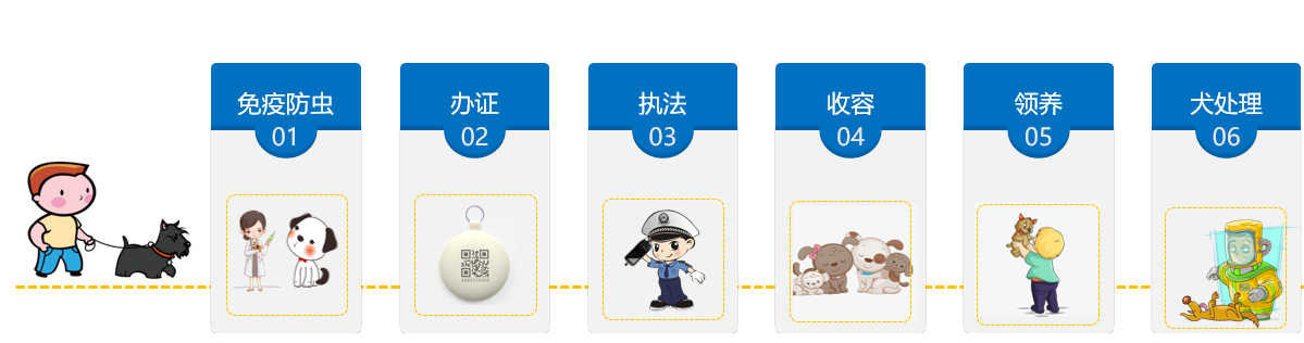 犬只管理平臺(tái)主要由5大業(yè)務(wù)流程:免疫防蟲(chóng)、辦證、執(zhí)法、收容、領(lǐng)養(yǎng)等。當(dāng)然這個(gè)流程不同城市略有差異。防疫和辦證主要在寵物醫(yī)院比較多,也有社區(qū)設(shè)置便民服務(wù)點(diǎn)。